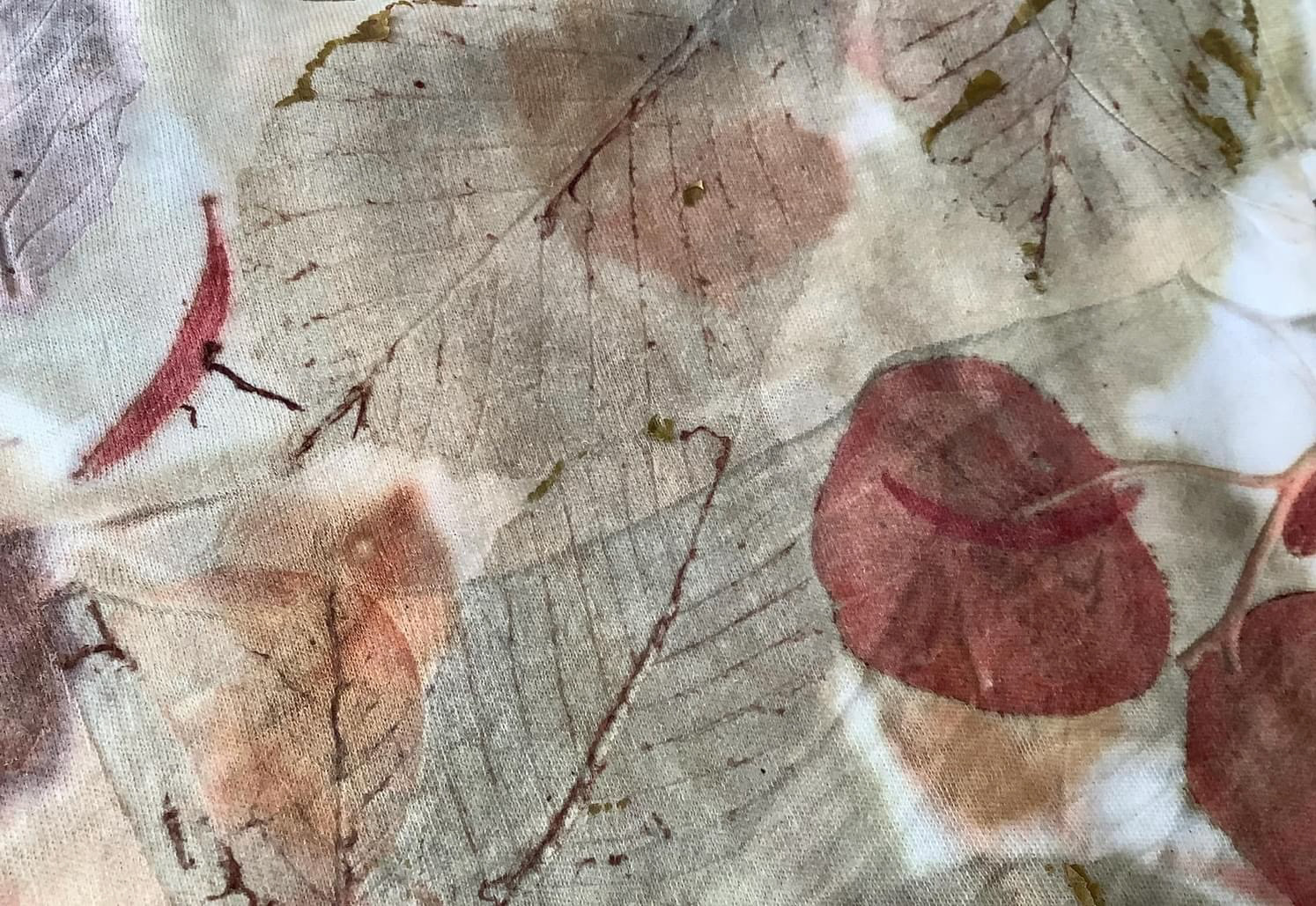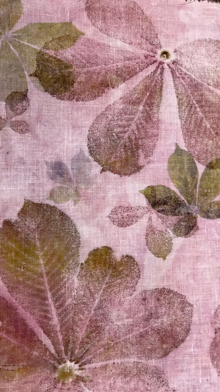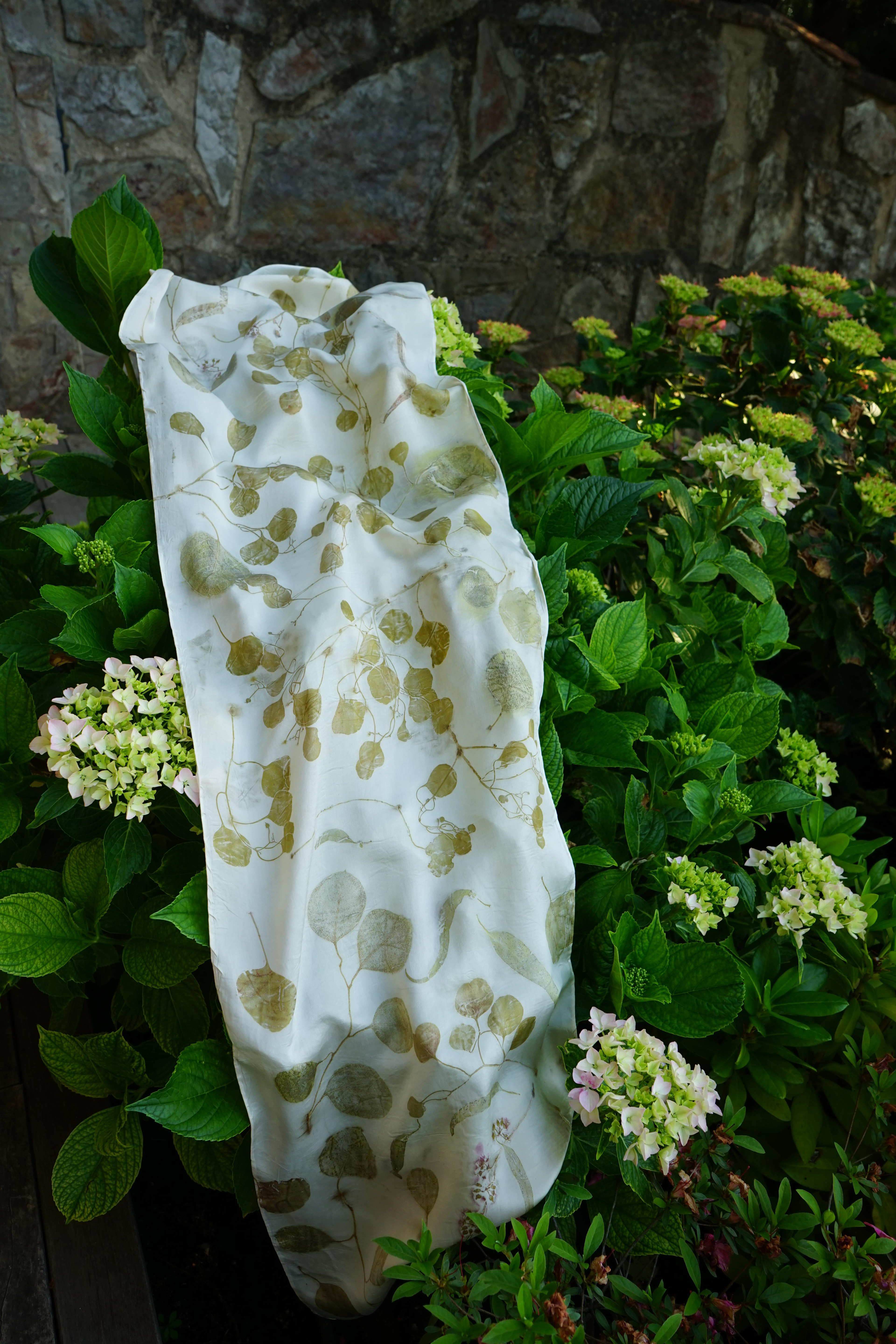 It is the plants leaving their portrait on the cloth. An alder leaf, the veil of a cosmos, the fine branching of eucalyptus. Each one stamps its form, its vein, its naked truth.