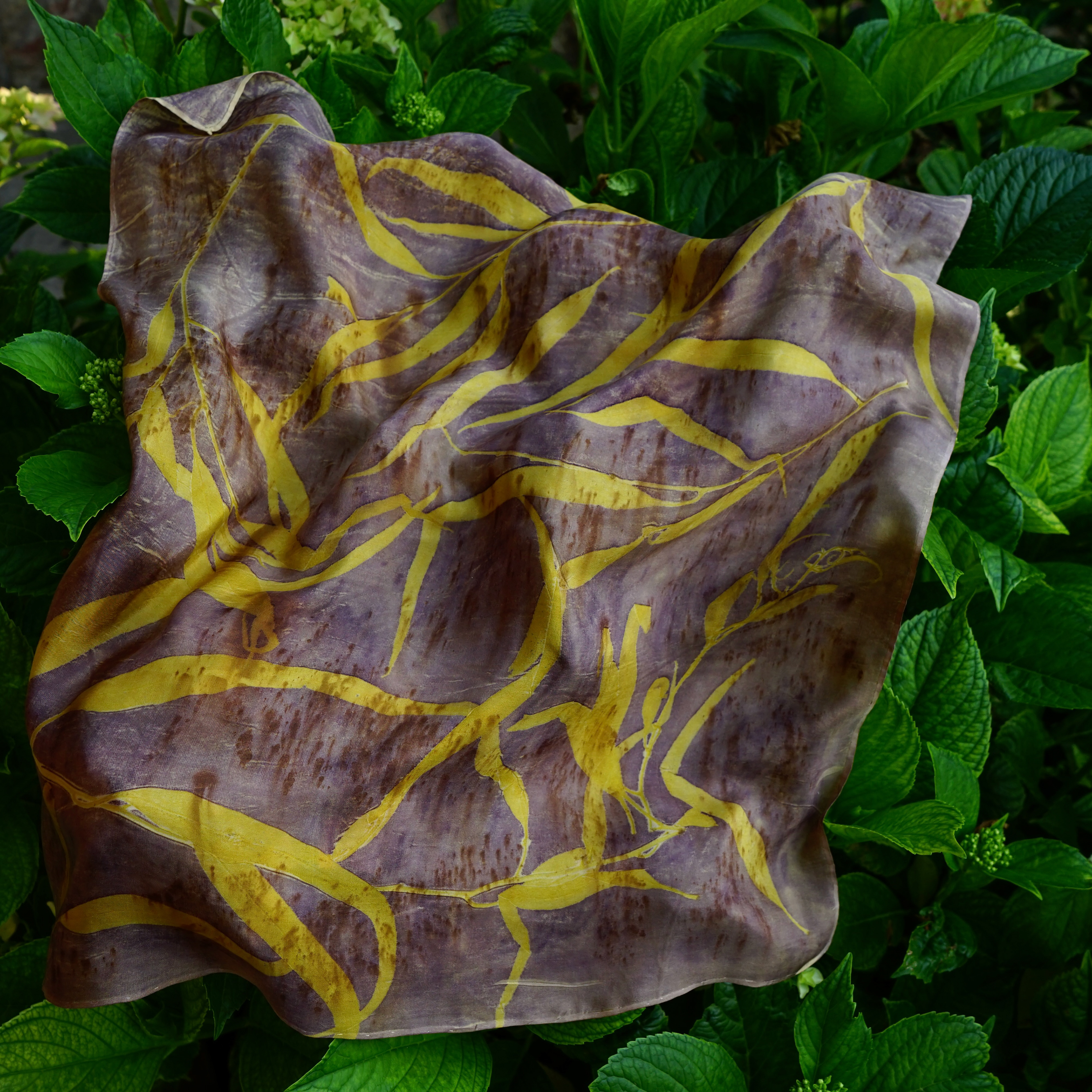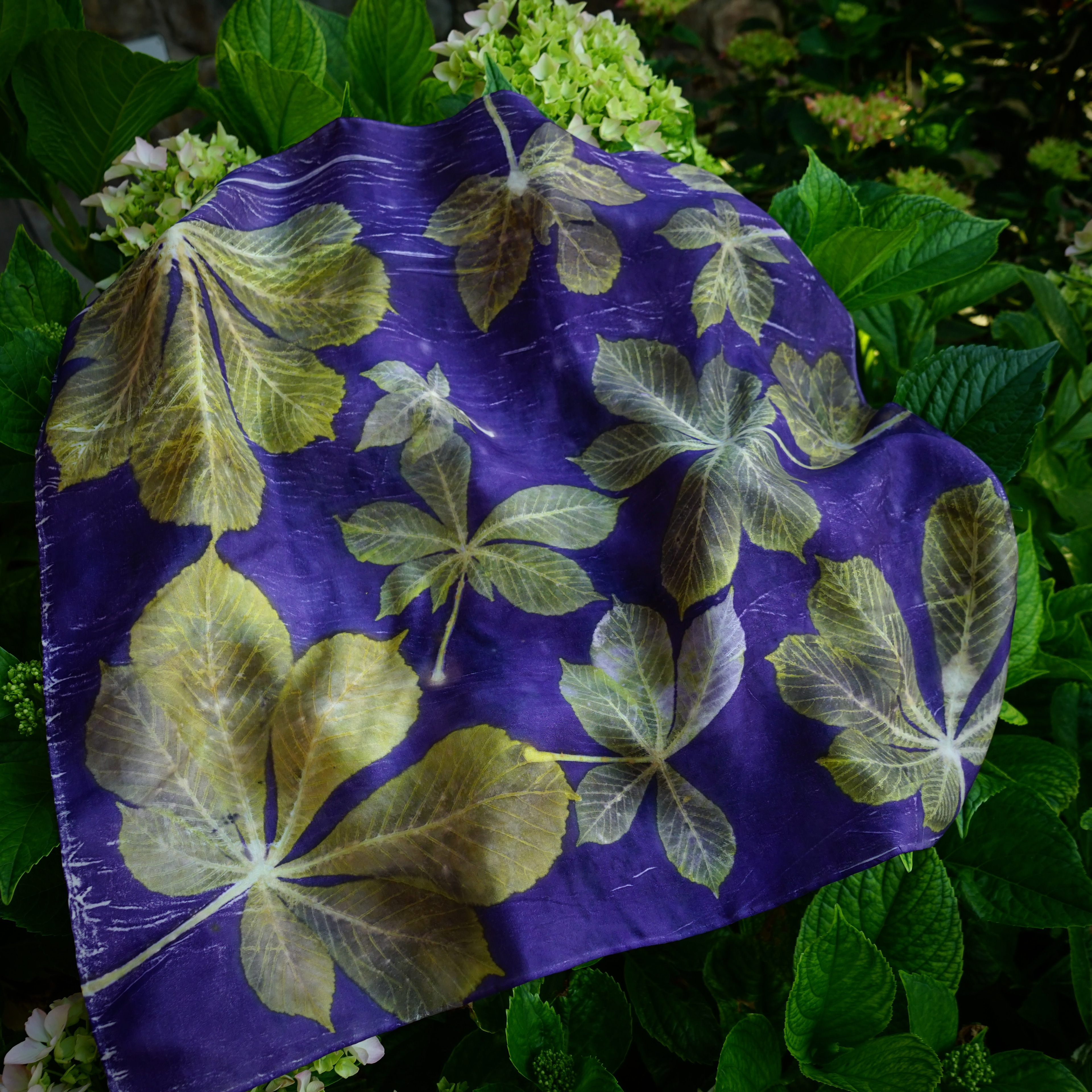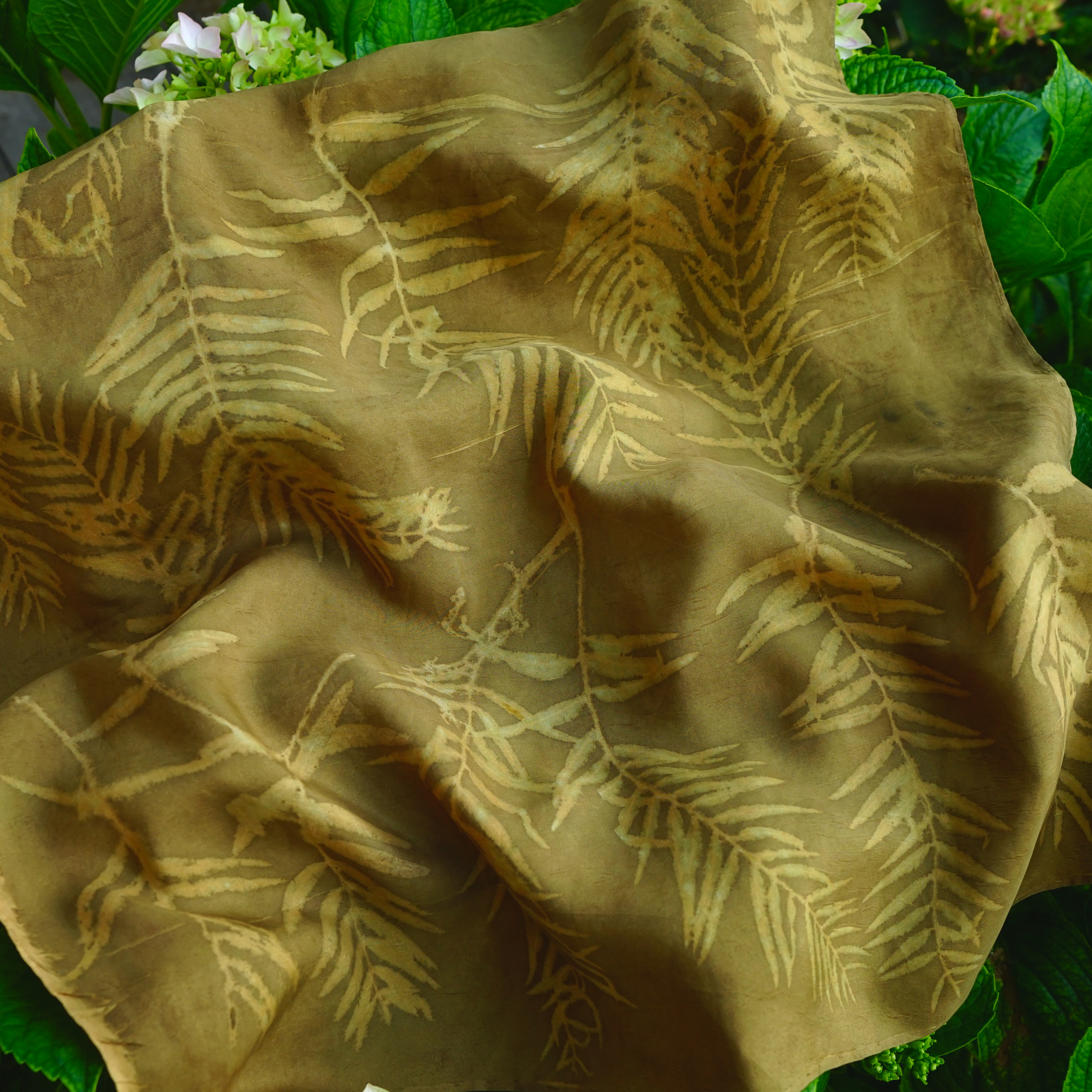 It is the plants leaving their portrait on the cloth. An alder leaf, the veil of a cosmos, the fine branching of eucalyptus. Each one stamps its form, its vein, its naked truth.