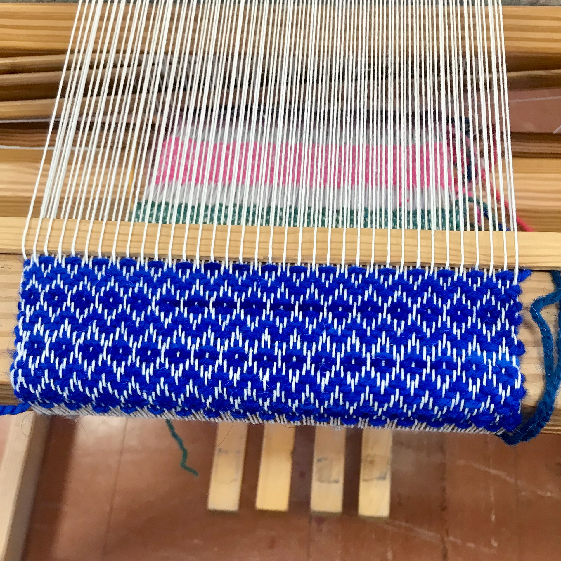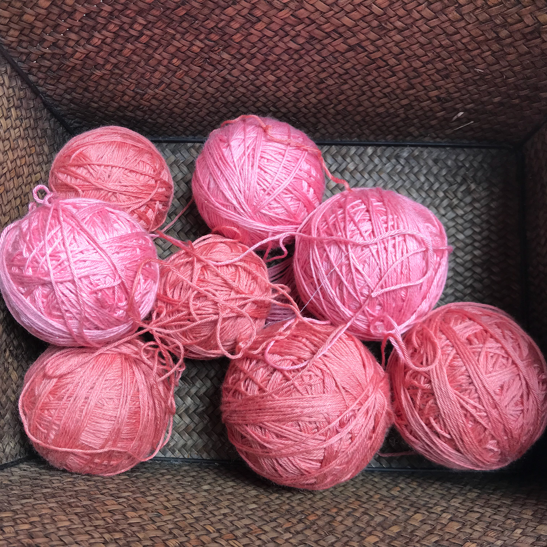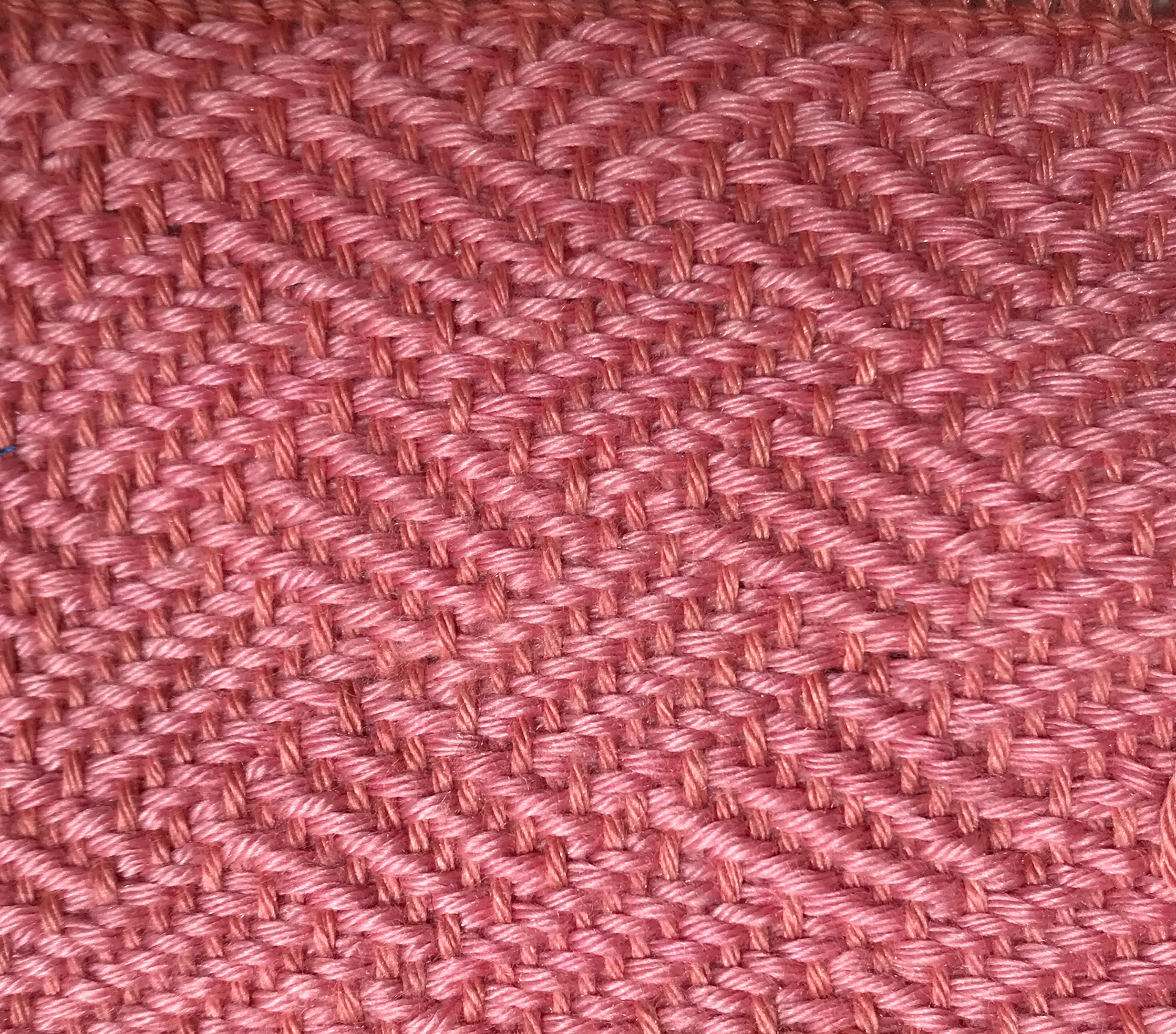 Shawl measuring 200x80 cm, woven on a low-warp loom in a twill weave, composed of 70% merino wool and 30% silk, dyed with cochineal and madder dyes in two distinct tones for the warp and weft. Currently in progress